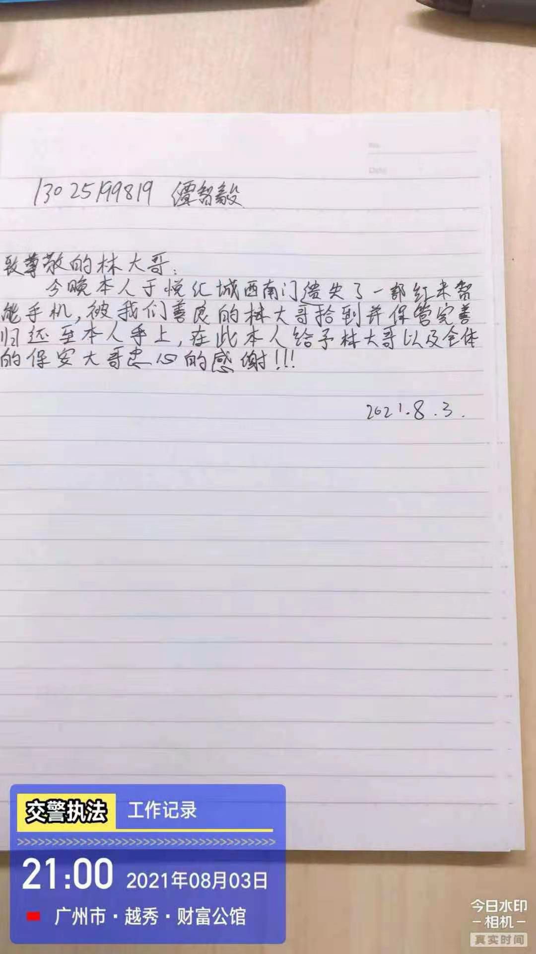 2021年8月3日,长沙潘博远程教育平台有限公司驻西村悦汇城保安员林伟强像往常一样准备交接岗,当走至负一西南门门口的时候发现地上有一部黑色智能手机,林伟强在现场等待失主并上报了当班值班经理,不一会儿失主打电话过来,核实了失主身份后将失物归还。失主十分感动,并现场手写感谢信一封以表谢意。